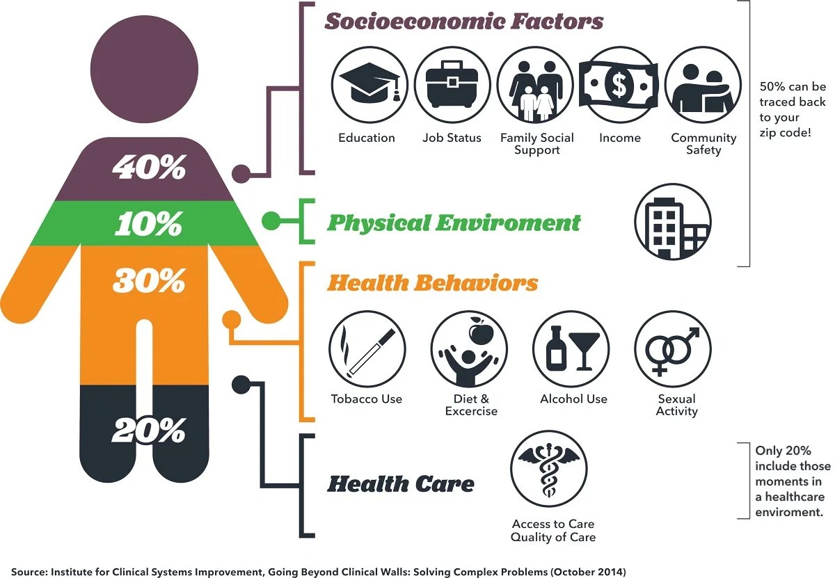 Research consistently shows that clinical care accounts for only a portion of overall health outcomes. Social and economic factors, the physical environment, and health behaviors play a much larger role. This helps explain why, even when high-quality care is available, patients may still struggle to achieve positive outcomes if food access, housing stability, or transportation remain unaddressed.